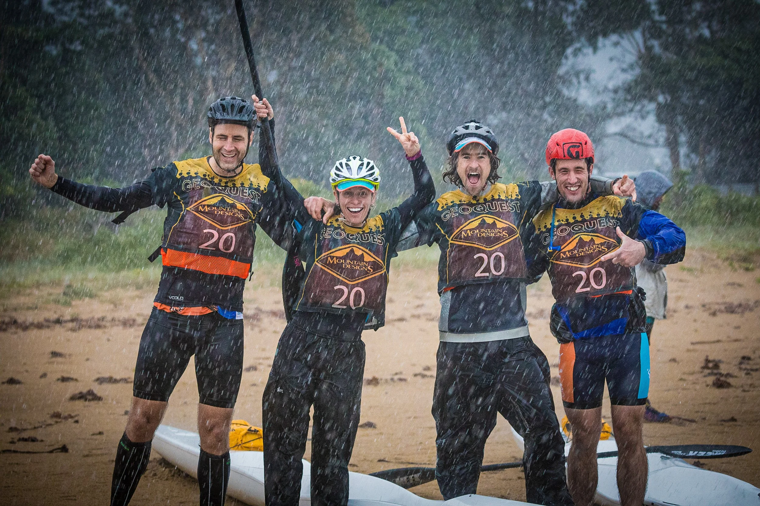 Before leaving the TA we had to complete the archery challenge. Luckily Josh had done this before and shot 3 from 3, Leo managed to fluke the other 2 whilst Bern and Hugh at least learnt to shoot an arrow vaguely at the target. We left in front, ahead of Peak Adventure who looked like they might have a bit of trouble collecting their arrows. It was mostly a bitumen ride made challenging with limited visibility due to the teeming rain. A creek crossing and short ride on a beach path into the final TA we had made good time.